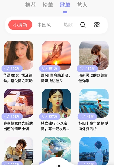 4、发现和收藏歌单:点击“歌单”,浏览不同分类的歌单,提供小清新等多种风格的歌单资源。