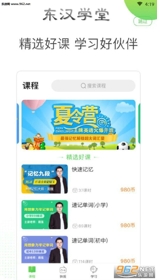 《东汉学堂》是一款专为家长打造的在线学习培训类软件,功能强大。在这里,家长可以帮助孩子直接选择不同的课程进行在线学习培训,还能为孩子量身定制学习计划,助力孩子取长补短、全面发展,解决学习过程中遇到的问题。有需要的朋友快来体验吧!