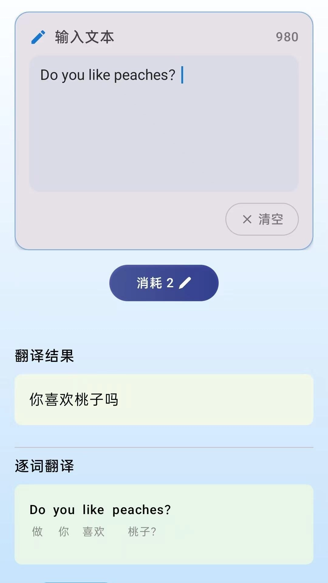 1、在翻译页面输入文本就能快速完成翻译,并且支持逐词翻译功能