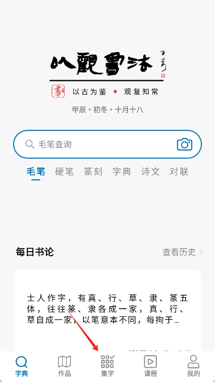 2、然后打开应用,在底部的导航栏中找到并点击“集字”图标。