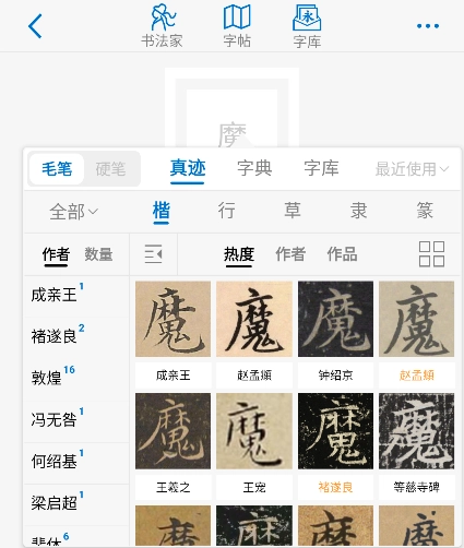 这是一部书法大字典,能够查询行书、草书、隶书、篆书、楷书等多种字体,其中收录的书法字形数量超400万;此外,还收录了超过130万的硬笔字形。