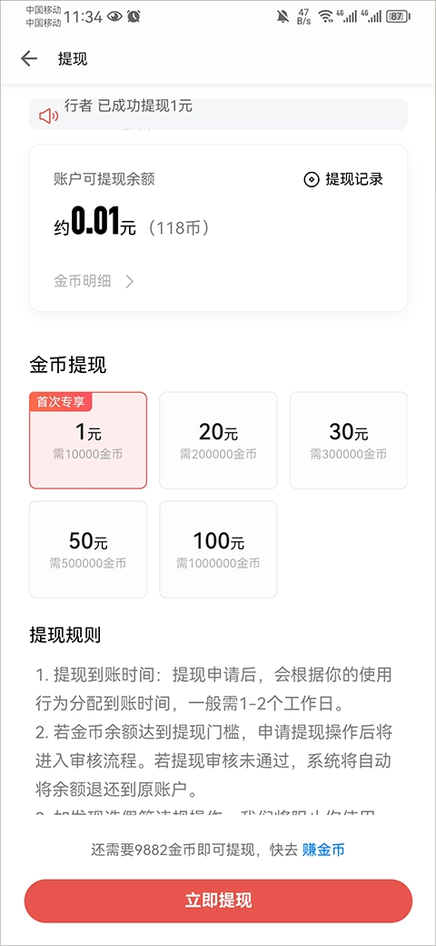 2、当金币余额满足提现要求时,提交提现申请后会进入审核阶段。若提现审核未通过,系统会自动把余额退回至原账户。
