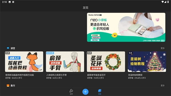4、并且在发现板块中还提供了课堂、集市和模板等内容供用户选择使用。