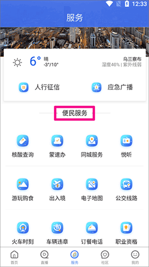 1、首先,打开软件,在服务页面能看到不少便民服务,点击其中任意一项就能启动服务;