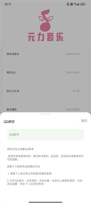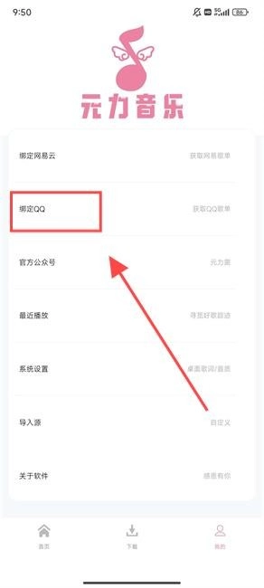 3、在设置界面选择“绑定QQ”后,即可导入qq歌曲