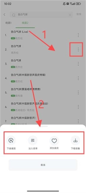 6、点击歌名后的小三点标志,可以将歌曲加入歌曲、收藏、等