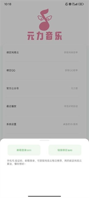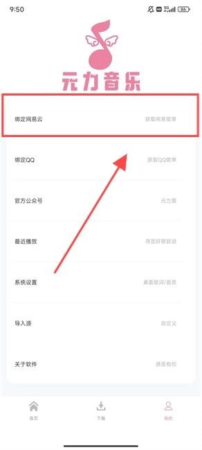 3、进入设置界面后点击“绑定网易云”,根据自身需求选择合适的绑定方式,完成操作后就能获取并导入网易云歌单了。