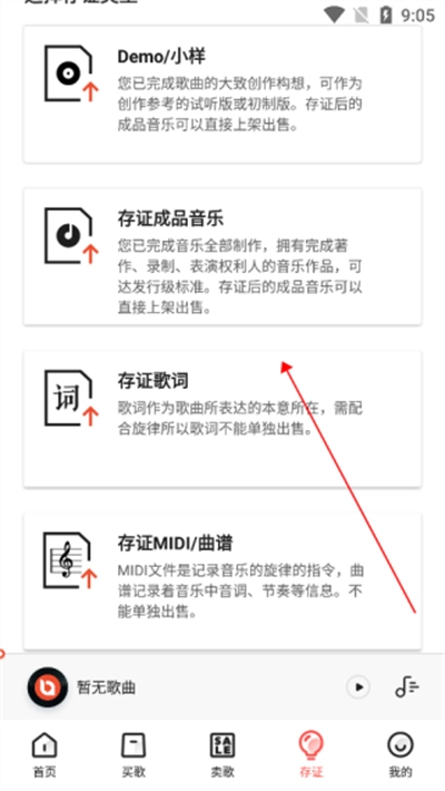 2.你可从Demo/小样、存证成品音乐、存证歌词、存证MIDI/曲谱里挑选其中一项完成上传操作。