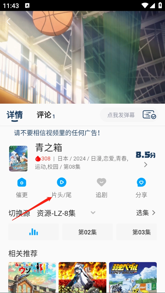 1、打开一部喜欢的动漫进入,点击片头/尾。