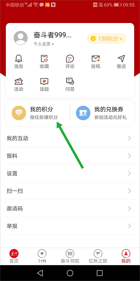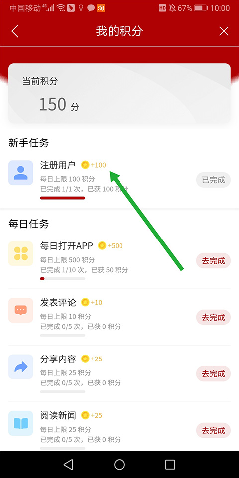 用户进入软件的“我的积分”页面后,只要根据任务要求完成相应任务就能获得积分,其中新手完成用户注册任务可获得100积分。