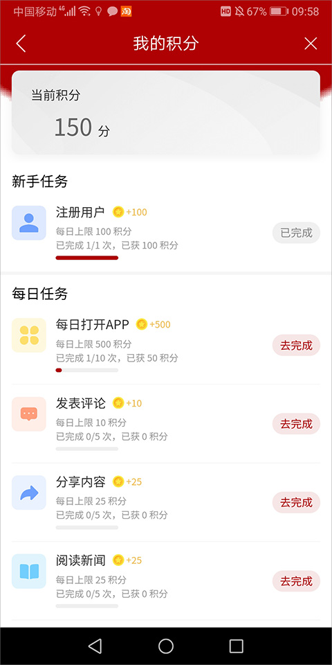 3、进入我的积分页面后,新手用户可通过完成注册用户任务获取积分,非新手用户则可在每日任务中参与发表评论、分享内容、阅读新闻等任务来积累积分。