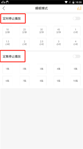3、现在我们进入了“睡眠”模式,在这里可以选择定时时间来设定播放的停止时间,也能通过选择小说的集数来确定播放到哪一集后停止。