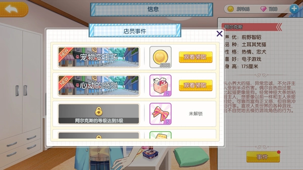 2、每位R卡及以上品质的店员,都拥有一间只属于你们的秘密小屋。在这里,你不仅能为他更换制服、调整房间布局,更能开启私密对话——聊童年趣事、吐槽天气、分享一首小众歌单。专属事件随角色等级逐步开放,关系越深,解锁的故事越柔软、越真实。