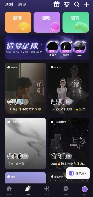 每一间房间都是一个新的世界,等待你来探索。主动发起连麦,与声音悦耳的人邂逅,若聊得投机,不妨互相比心,添加好友,让友谊的小船扬帆起航。