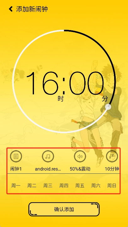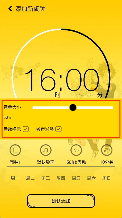 4、调整设置:调整闹钟的音量大小确保能够被听到,设置闹钟响铃的持续时间后点击“确认添加”完成设置。