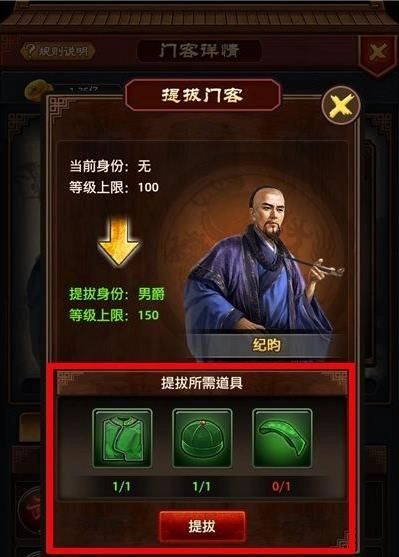 3、点击“提拔”按钮查看升级所需条件,要求集齐绿色装扮三件套。三个相同的绿色装扮能够合成一个蓝色装扮,三个相同的蓝色装扮可以合成一个紫色装扮,合成难度越大,门客的等级就越高。