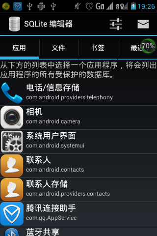 准备就绪后,我们打开软件,能看到该应用提供了两种修改数据库文件的方式:一种是从应用列表里根据应用名称选择对应应用的数据库,另一种则是自行查找数据库文件的地址来进行修改。