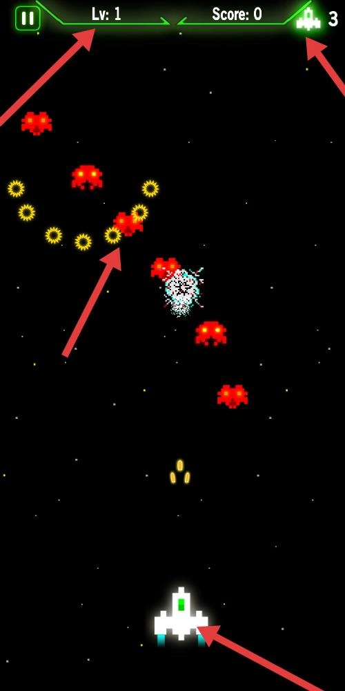 1、经典还原设计:100%复刻原版像素艺术风格,飞船造型、外星敌人等元素完整保留,关卡布局严格遵循经典设计,标志性盾牌防御系统与神秘的红色飞碟奖励机制也均有呈现。