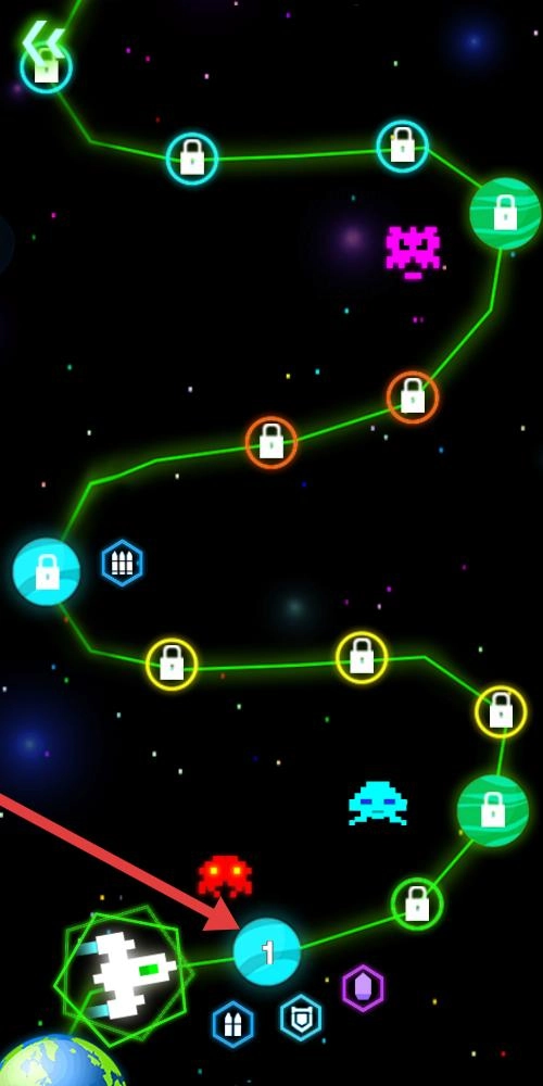 2、关卡界面呈现宇宙场景光带连接众多星球,锁形图标标记未解锁关卡,标有1的蓝色星球是首关,点击踏上星际挑战的征程。
