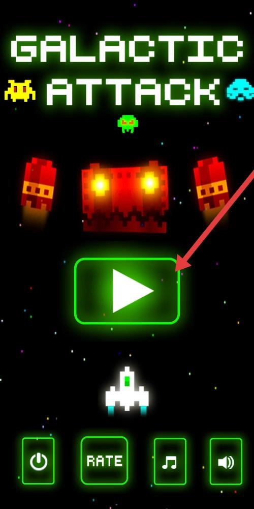 1、启动界面以黑色为底霓虹绿的GALACTIC ATTACK字样醒目,中间播放按钮突出,评分、音乐等功能键,点击按钮开启战斗。