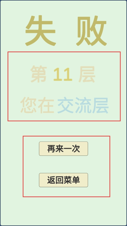 3、失败后,可点再来一次重玩,或返回菜单选设置调整,重新挑战突破第11层,成功搭建突破交流层。