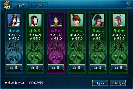招募界面左下方显示着刷新时间,每小时会有一次刷新将领的机会。一旦刷新时间到了,就别犹豫直接使用这次机会。酒馆每次刷新会随机出现6名将领。如果还没到刷新时间,也可以用仙石或礼券手动刷新酒馆。通常手动刷新几次就能得到蓝色品质及以上的散仙,而自动刷新功能可以选择目标将领的品质,还能设置最大刷新次数。要仔细查看散仙的“潜力”和“资质”,这两项是衡量散仙强弱的关键指标。