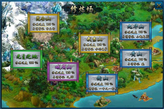 其他六座名山在没有帮派占据时为固定的修炼空间30个,用户进入挂机修炼为名山默认的加成速度,其中峨眉和昆仑山的基本速度提升20%,其他4座基本速度提升10%