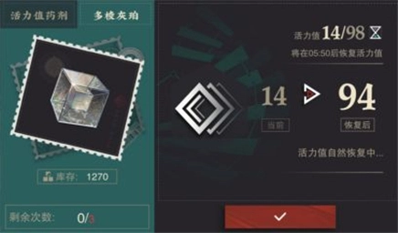 活力储存上限会随着账号等级提升而提升,活力在没有存储满的情况下,活力每8分钟自然恢复1点,活力在存储满之后不再自然恢复(使用活力药水或者直接购买活力,这个情况下活力可以超出存储上限)。60多棱灰珀可以购买80活力,每天只能购买三次。零食答礼活动每天会赠送30活力药水。