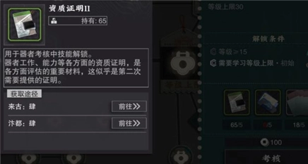 考核需要资源种类较多,资质证明为通用材料,所有角色升级都会需要。对应职业需要对应的核定书和其他材料。若不清楚材料在哪里获取,可以点击需要的材料图标,会显示材料获取途径。