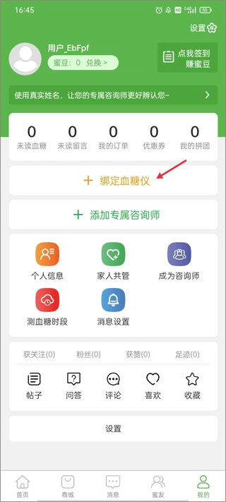 1. 登录软件账号后,切换至“我的”界面,选择绑定血糖仪。