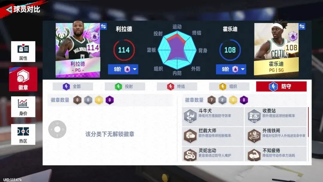 再来看霍乐迪的能力徽章,防守徽章足足有9个,所以到中场你的得分后卫没有体力上场时,完全可以让霍乐迪上场限制对方得分后卫。并且霍乐迪也是真便宜啊,升到九阶估计也只需要4000万的样子。