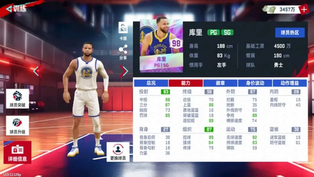 可以看到九阶的哈利伯顿的三分投射指数达到了93,其实这个数值还是挺不错的了,5阶的库里三分指数也只有97。其次哈利伯顿的禁区投篮指数还是很高的,所以花5000万突破到满阶还是可以的。