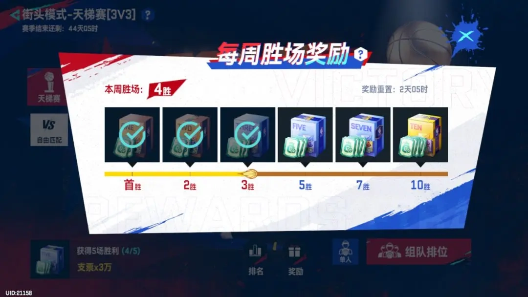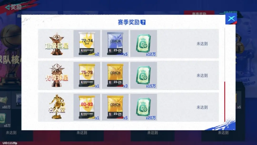 PVP每周胜场奖励(王朝、街头共用):天梯赛和自由匹配两种模式共同享受“每周胜场”奖励,达成一定胜场,可以获取教练卡包、支票(转会市场获取球员的重要资源)、资金等丰厚奖励。