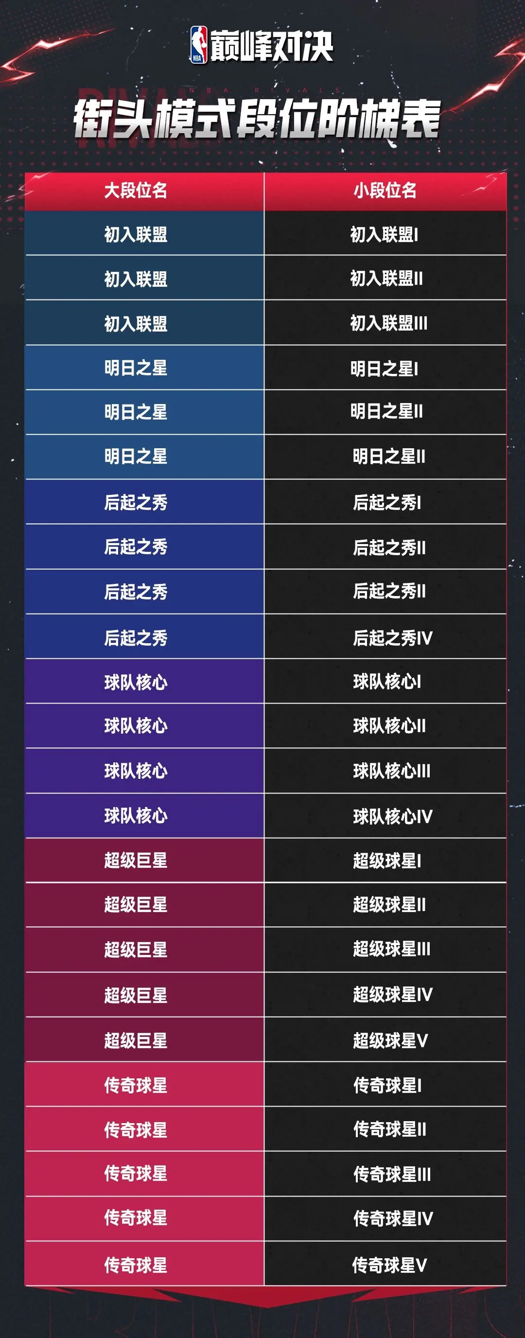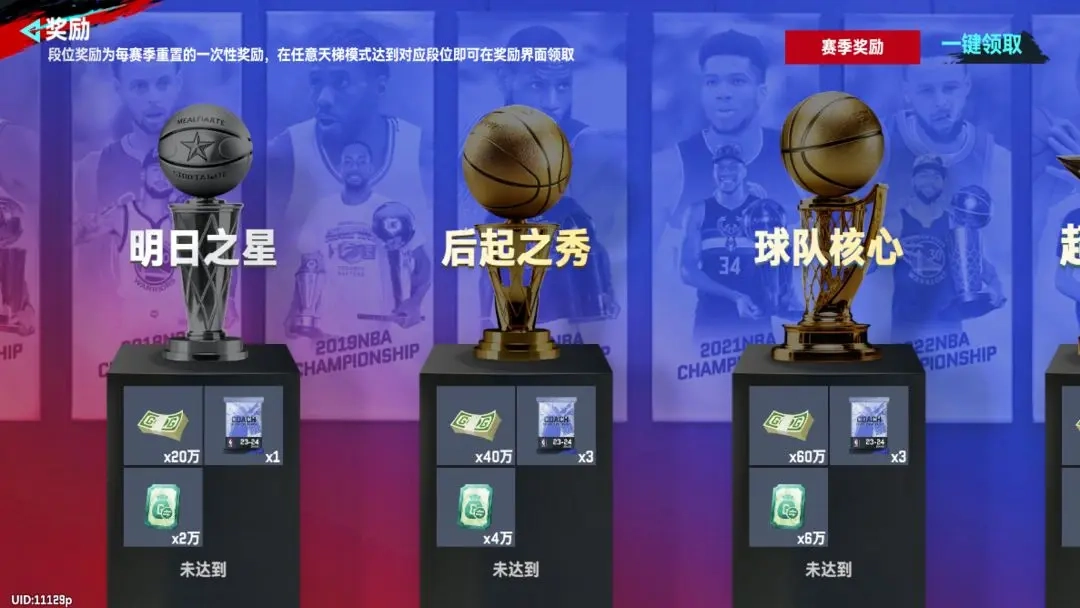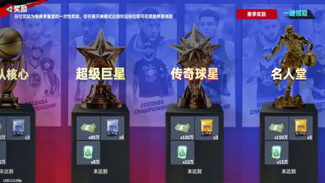 在天梯赛季中,玩家的目标是在赛季结束前攀登7个不同的段位阶梯。这些段位依次是:初入联盟、明日之星、后起之秀、球队核心、超级巨星、传奇球星、以及最终的名人堂。