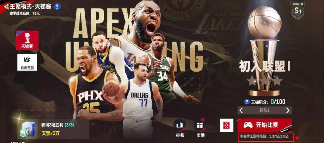首先,进行天梯赛匹配,大家需要组一支符合“工资帽”限制要求的球队。赛季的工资帽要求,可以在天梯赛“开启比赛”按钮的右下角查看。