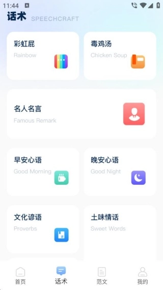 3、汇聚海量话术资源,涵盖彩虹屁、名人名言、早安心语等多种类型,以契合不同场景的语言表达需求。