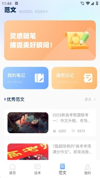4、还可以去查看各种范文内容,手机点击就可以进入到阅读,进行我的笔记记录。
