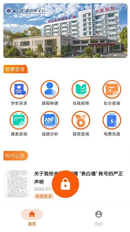 2、进入应用首页,可看到诸多管理功能,并能翻看校内公告;