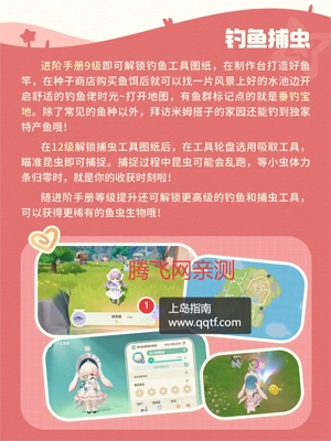 当进阶手册达到9级,就能解锁钓鱼工具图纸。在制作台打造好鱼竿,再到种子商店买好鱼饵,就可以寻觅一处风景绝佳的水池边,开启惬意的钓鱼时光啦~打开地图,有鱼群标记的地方便是垂钓的好地方。除了常见的鱼种,要是去米姆搭子的家园拜访,还能钓到独特的特产鱼呢!进阶手册到12级解锁捕虫工具图纸后,在工具轮盘选择吸取工具,对准昆虫就能捕捉。不过捕捉时昆虫可能到处乱蹦,等它体力条归零,就能收获到手啦!随着进阶手册等级升高,还能解锁更高级的钓鱼和捕虫工具,从而获取更珍稀的鱼虫生物哦!