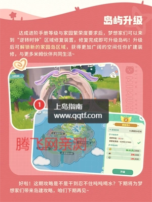 达成进阶手册等级与家园繁荣度要求后,梦想家们可以来到“逆转时钟”区域修复装置,修复完成即可升级岛屿!升级后可解锁新的家园岛区域,获得更加广阔的空间任你扩建装修,与更多米姆伙伴共同生活~