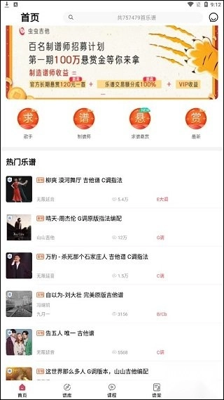 3、于首页,能够发现热门乐谱,并且还依据歌手与制谱师加以分类。