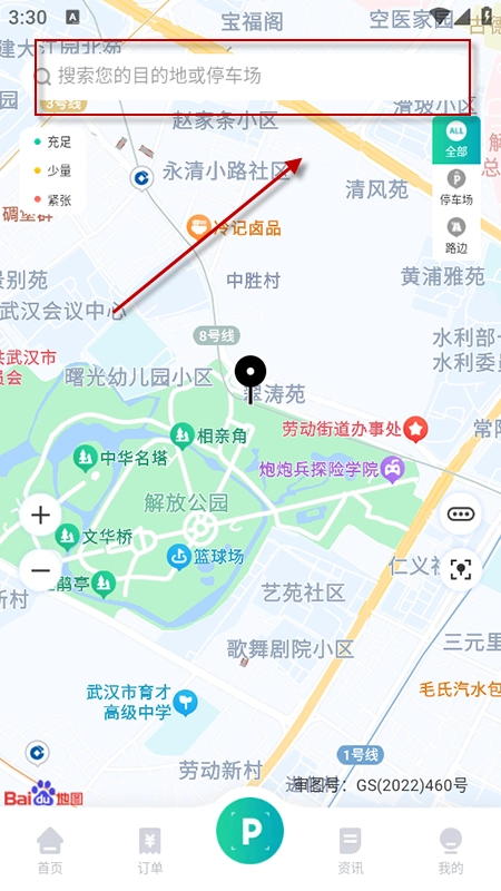 2、在软件内点击“ P”板块,在搜索栏输入目的地或直接查看周边停车场,了解各停车场的空闲车位情况。