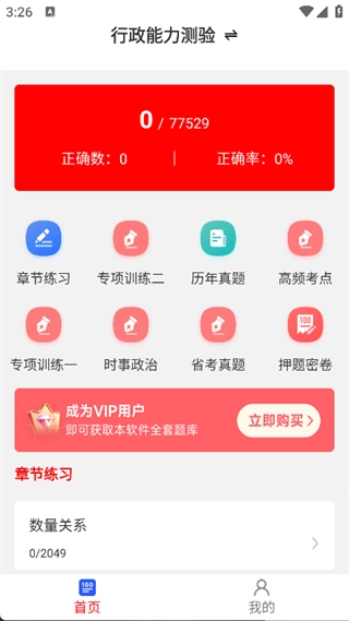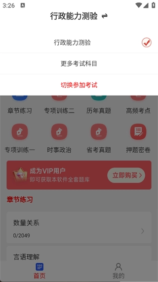 2. 在主页面即可看到行政能力测验,可以选择章节练习、专项训练、历年真题等,进行练习;
