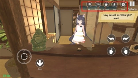3、走到洗脸台那儿,把香皂拿起来,按住手指图标搓出泡泡,接着轻柔地摸摸小忍的脑袋,这样重复做几次,随后拿起旁边的浴巾递给她,最后出去一趟再回来就行啦。