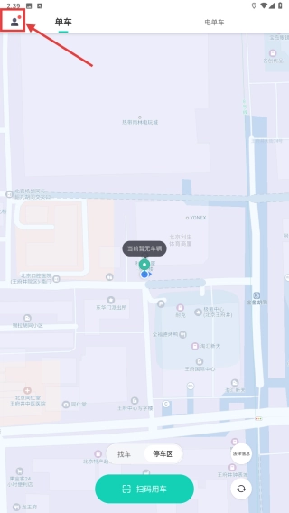 1、打开单车租赁应用,点击左上角头像图标,进入个人中心页面。