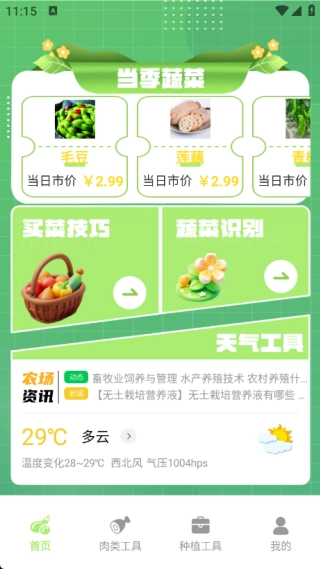 1. 首页提供了当季蔬菜价格,同时还设有买菜技巧、蔬菜识别以及天气工具等服务。