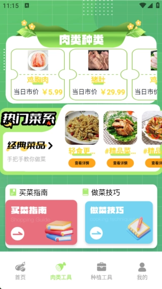 3、在肉类工具中可以了解内类种类、热门菜系,还有买菜指南和技巧;
