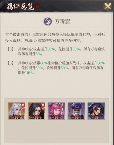 2、技能效果:增强万毒盒侠客所造成的伤害。并且,首个被击败的万毒宜侠客会被投入怪坛,炼制成兵神后重返战场,这可视为一种复活返场强化机制。该效果的出现,弥补了万毒侠客缺少前排的短板,使得他们能够专注于提升伤害。特别是万毒侠客尤川,身为神行职业侠客,复活返场后,切入敌方后排的操作会更加流畅自如。