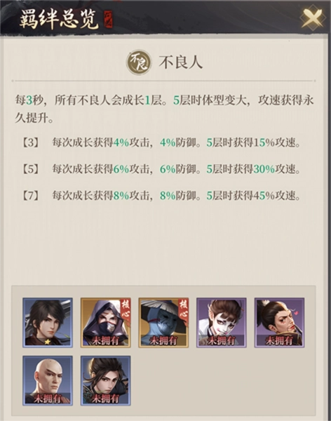 2、技能效果:战斗过程中,随着时间推移不断叠加,持续提升全体不良人阵营角色的攻击、防御与攻速,同时体型变大。这些加成属性在本场战斗中永久有效。如此一来,不良人阵营的侠客便具备在战斗后期产生质变的潜力。一些原本并非定位为输出的不良人角色,在阵营效果的层层叠加下,也能打出令人惊叹的输出表现。