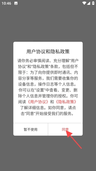 1、下载安装后,阅读同意“用户协议和隐私政策”。